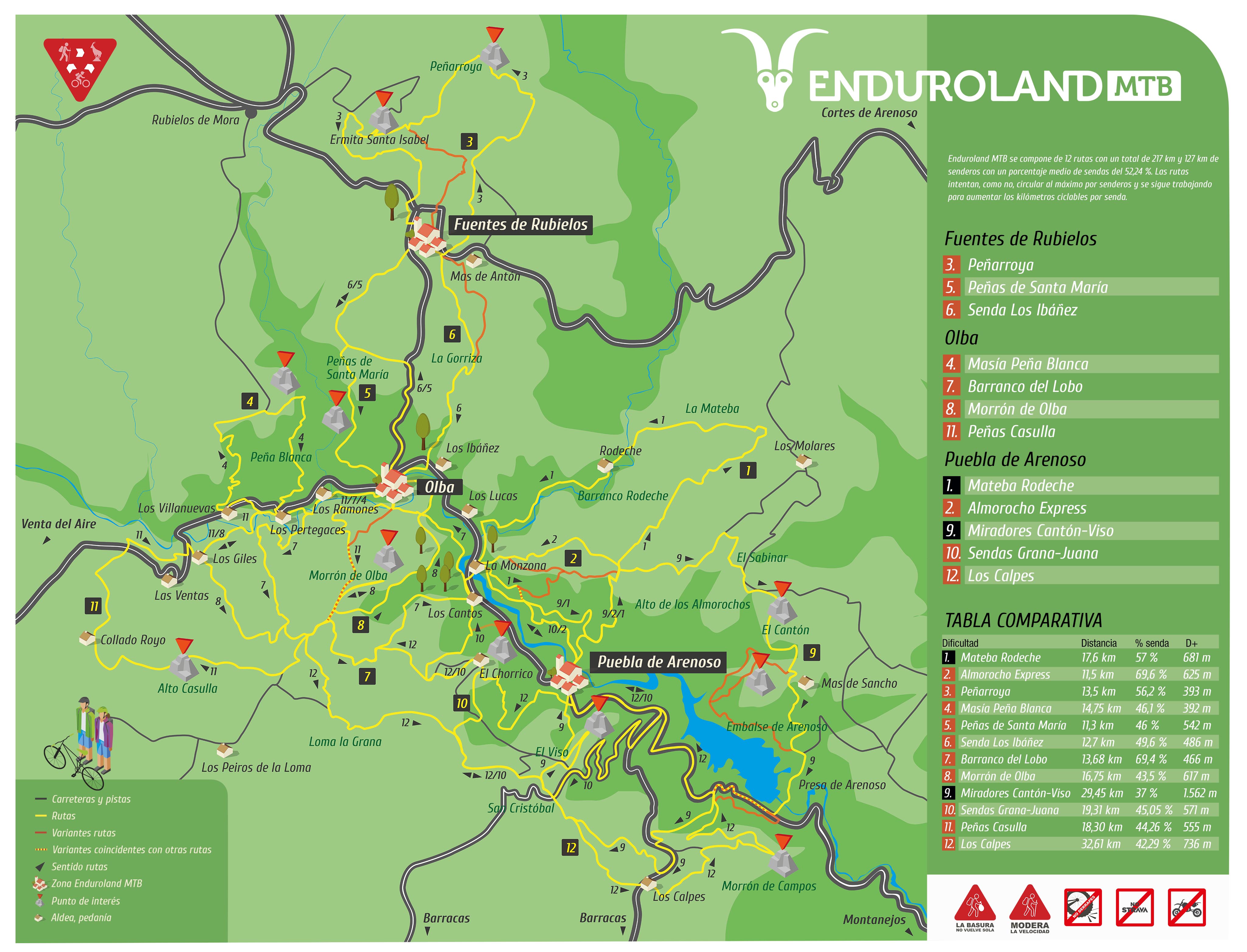 A caballo entre Castellón y Teruel, los municipios que actualmente integran Enduroland son: Fuentes de Rubielos y Olba en Teruel, y Puebla de Arenoso en Castellón. Se trata de una zona privilegiada muy escarpada y con paisajes brutales, a tan solo cuatro horas de Madrid, una hora y media de Valencia o Castellón y cuarenta y cinco minutos de Teruel. El embalse de Arenoso es el eje sobre el que circunvalan las rutas.